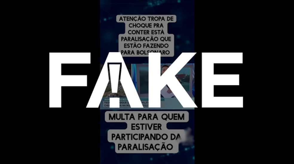 - Já a caixa de texto sobreposta às cenas tem a seguinte mensagem: “Atenção Tropa de Choque pra conter esta paralisação que estão fazendo para Bolsonaro. Multa para quem estiver participando da paralisação”.
