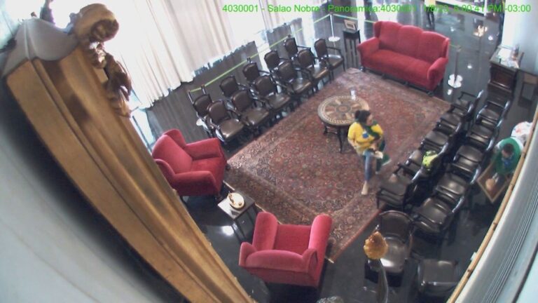 Vídeo inédito mostra mulher quebrando quadro de Renan Calheiros no Senado durante atos de 8 de janeiro