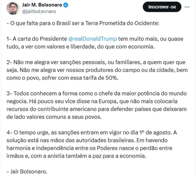 Bolsonaro diz que não se alegra com tarifa de Trump, mas que com anistia haverá ‘a paz para a economia’